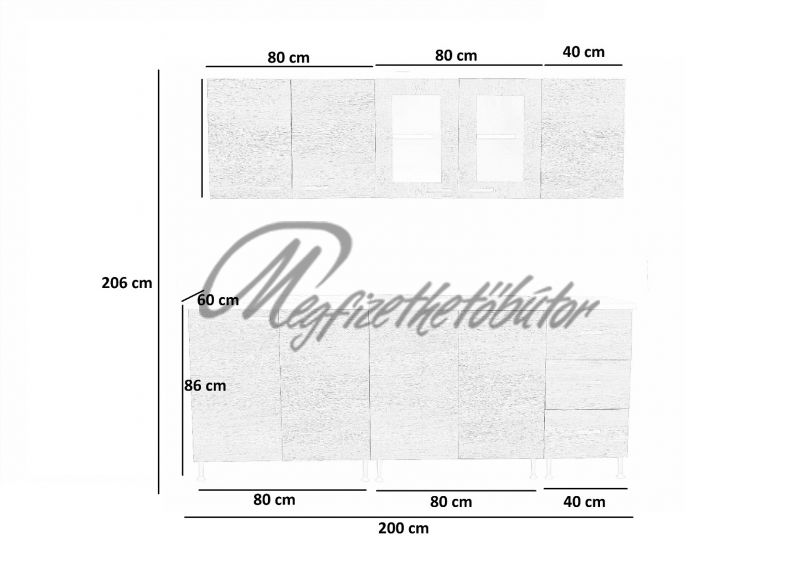 Konyhaelemek méretei (magasság, szélesség, mélység):